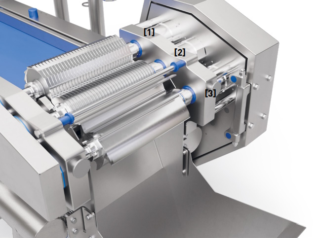 Продукт подается транспортером к подающему валу [1], который обеспечивает надежную подачу продукта на шпиндель дисковых ножей [2].